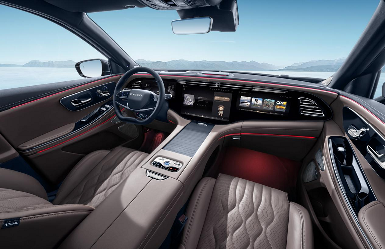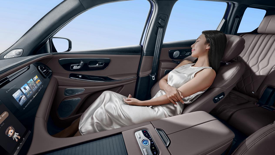 一抬头,大天窗带来通透视野体验的同时,碧空如洗一览无余,车内还有双色氛围灯+8 SONY音响系统,听歌、追剧带来沉浸式体验。第一排隔音玻璃有效隔绝风噪与胎噪,为宝妈带娃哄睡创造好环境,后侧隐私玻璃则让后排家人在小憩时免受强光打扰。三温区自动空调可独立调节每一排的温度,配合前排座椅加热与通风功能,无论春寒料峭还是午后升温,座舱始终保持最适宜的体感。