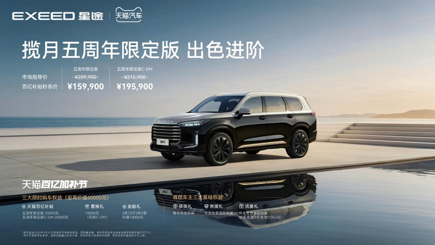 此外,揽月五周年限定版还带来了更“接地气”的门槛,市场指导价209900元,叠加“天猫百亿加补节”50000元补贴,秒杀价159900元。揽月五周年限定版C-DM“天猫百亿补贴”20000元,10000元置换礼,揽月五周年限定版C-DM市场指导价215900元,百亿补贴秒杀价195900元。同时还可享受价值10000元的5年10万3年0息金融礼,以及首任车主整车终身质保、终身免费道路救援、终身免费基础流量等首任车主基础权益。
